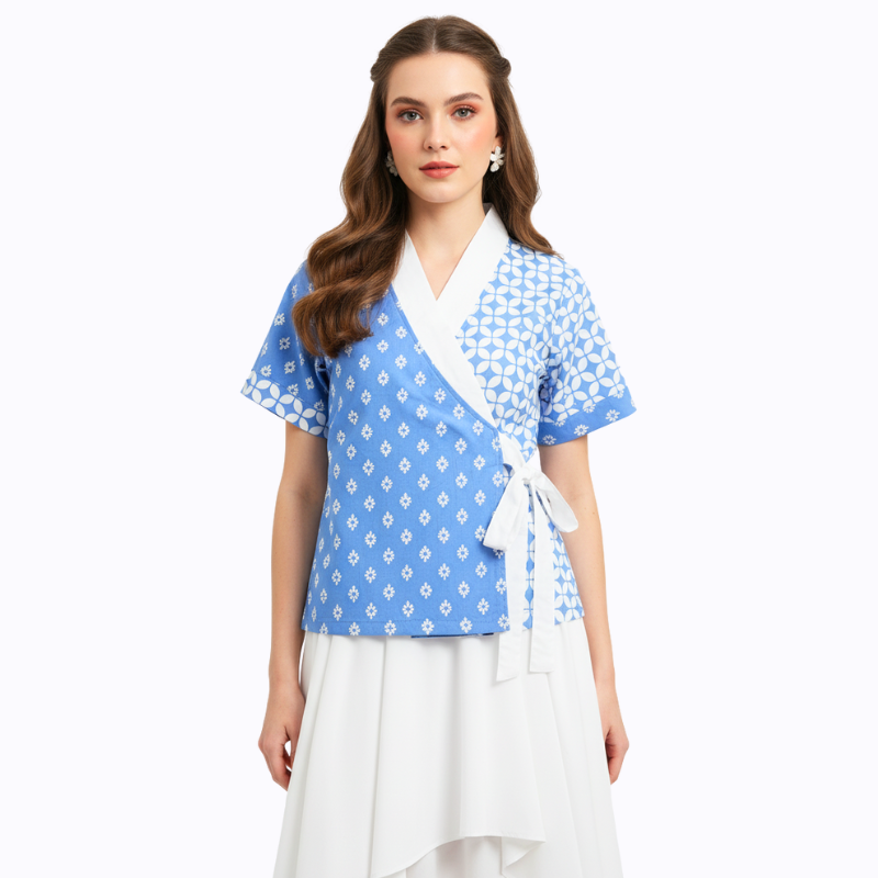 1. Blouse desain kimono dengan detail motif batik cap modern