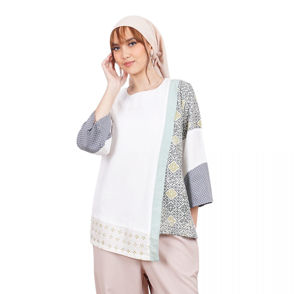 1. Blouse batik cap berdesain batwing dengan detail multi pattern