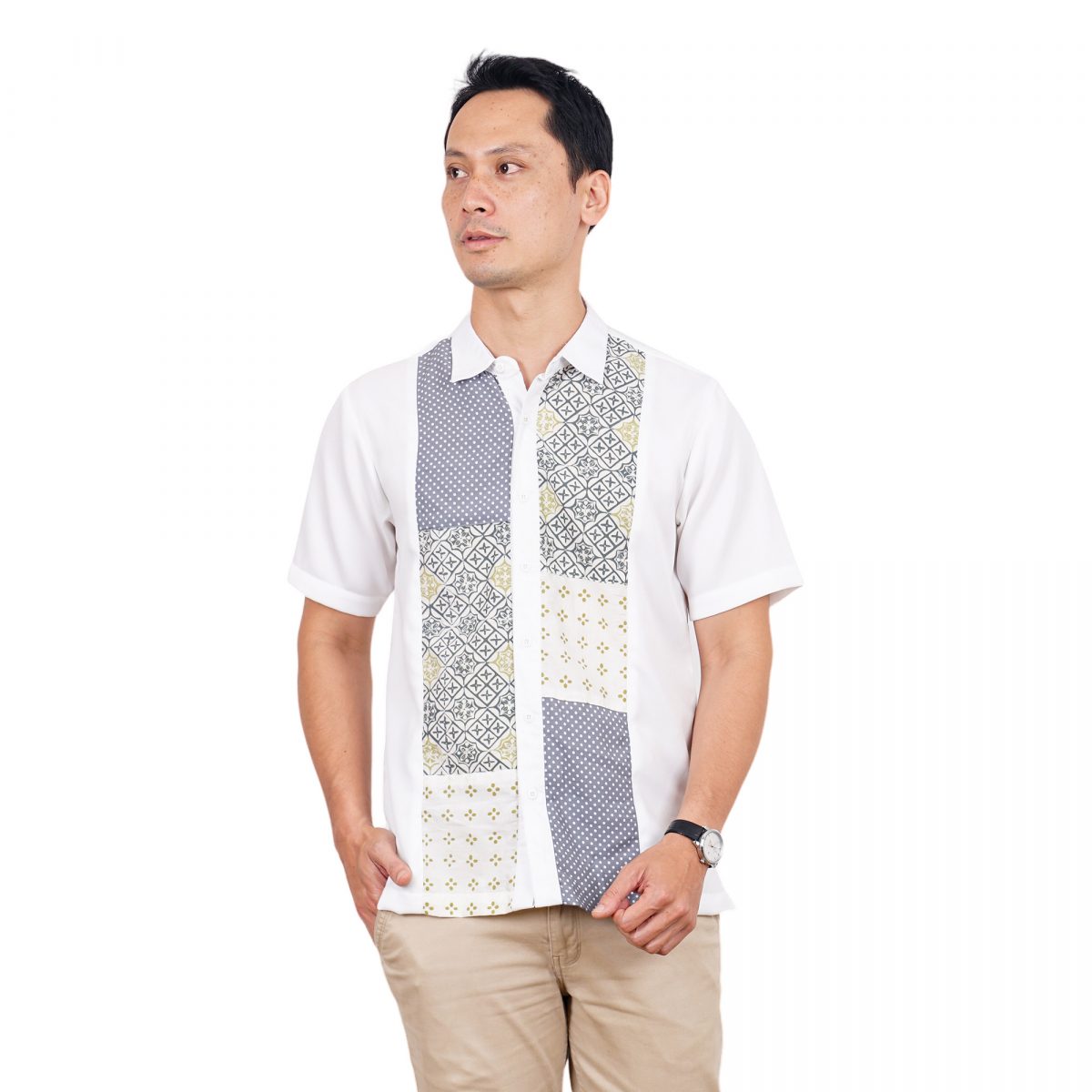 1. Kemeja dengan highlight patchwork batik print dibagian tengah