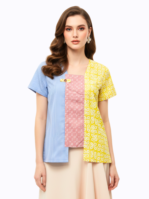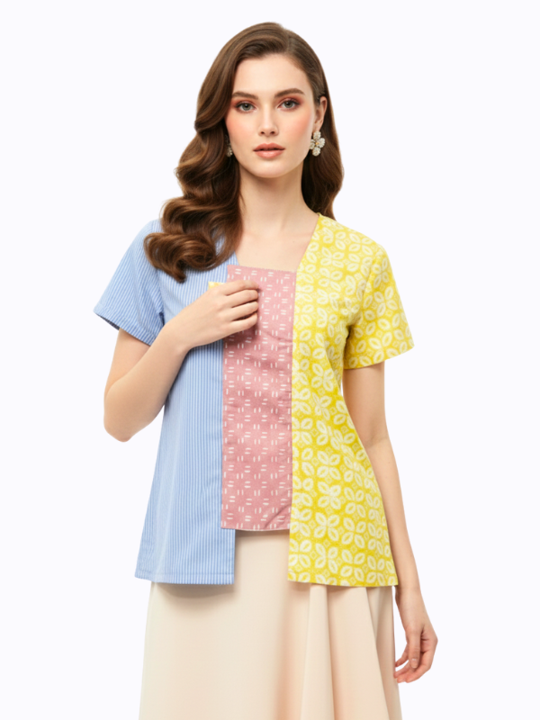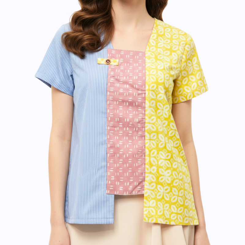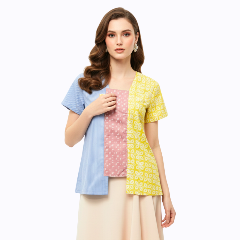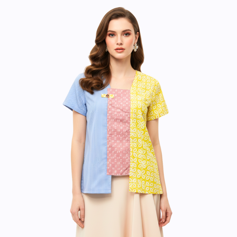 1. Blouse desain kutubaru dengan aksen batik cap bergaya ethnic modern