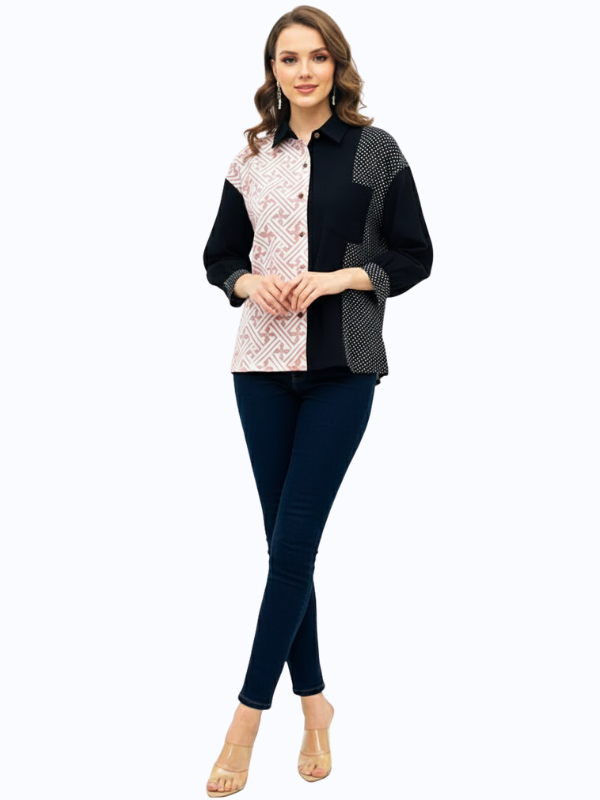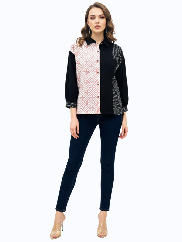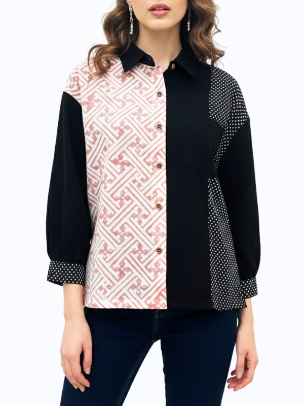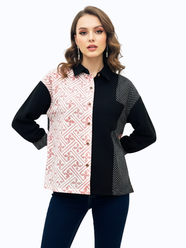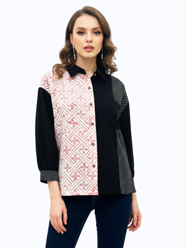 1. Kemeja bergaya semi formal detail motif batik cap yang modern