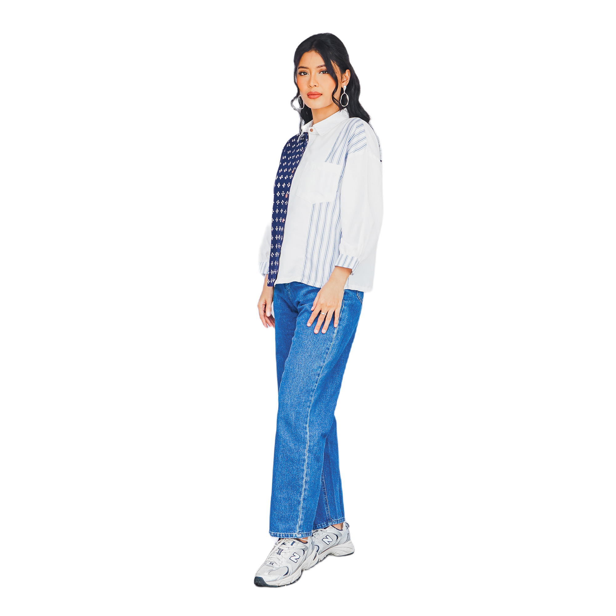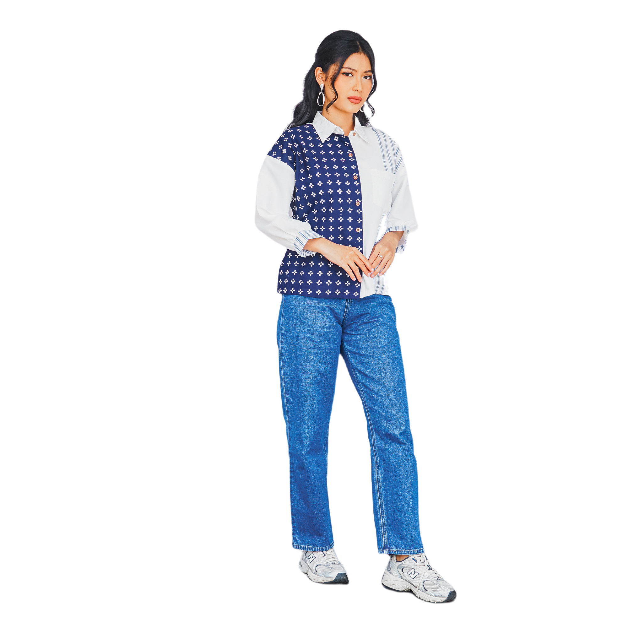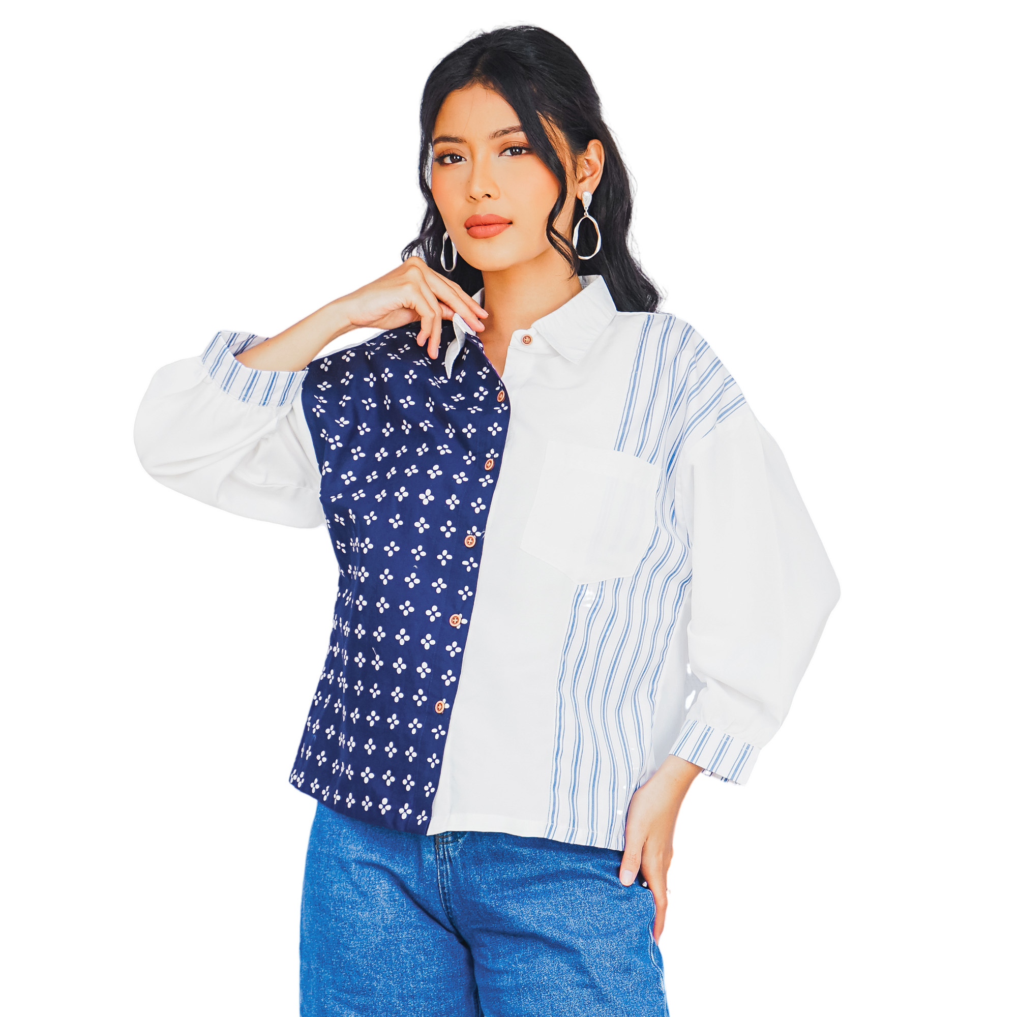 1. Kemeja bergaya semi formal detail motif batik cap yang modern