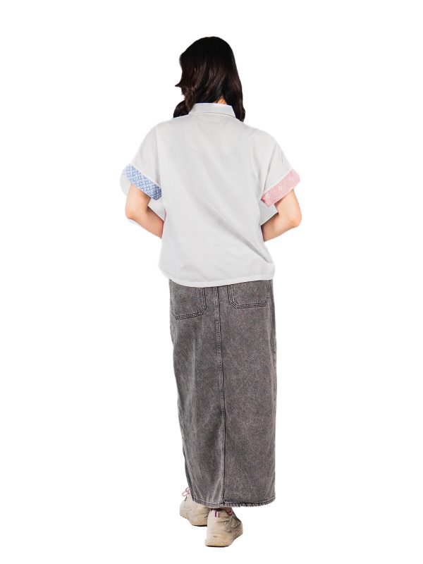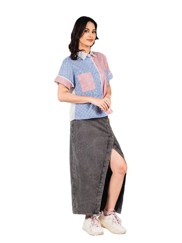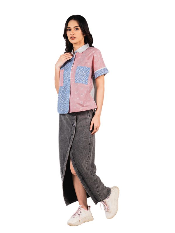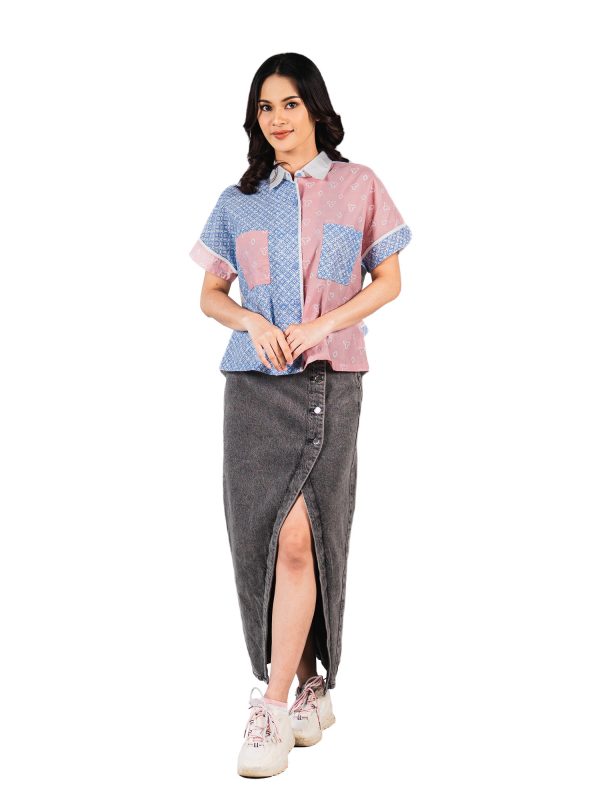 1. Kemeja bergaya semi formal detail motif batik cap yang modern