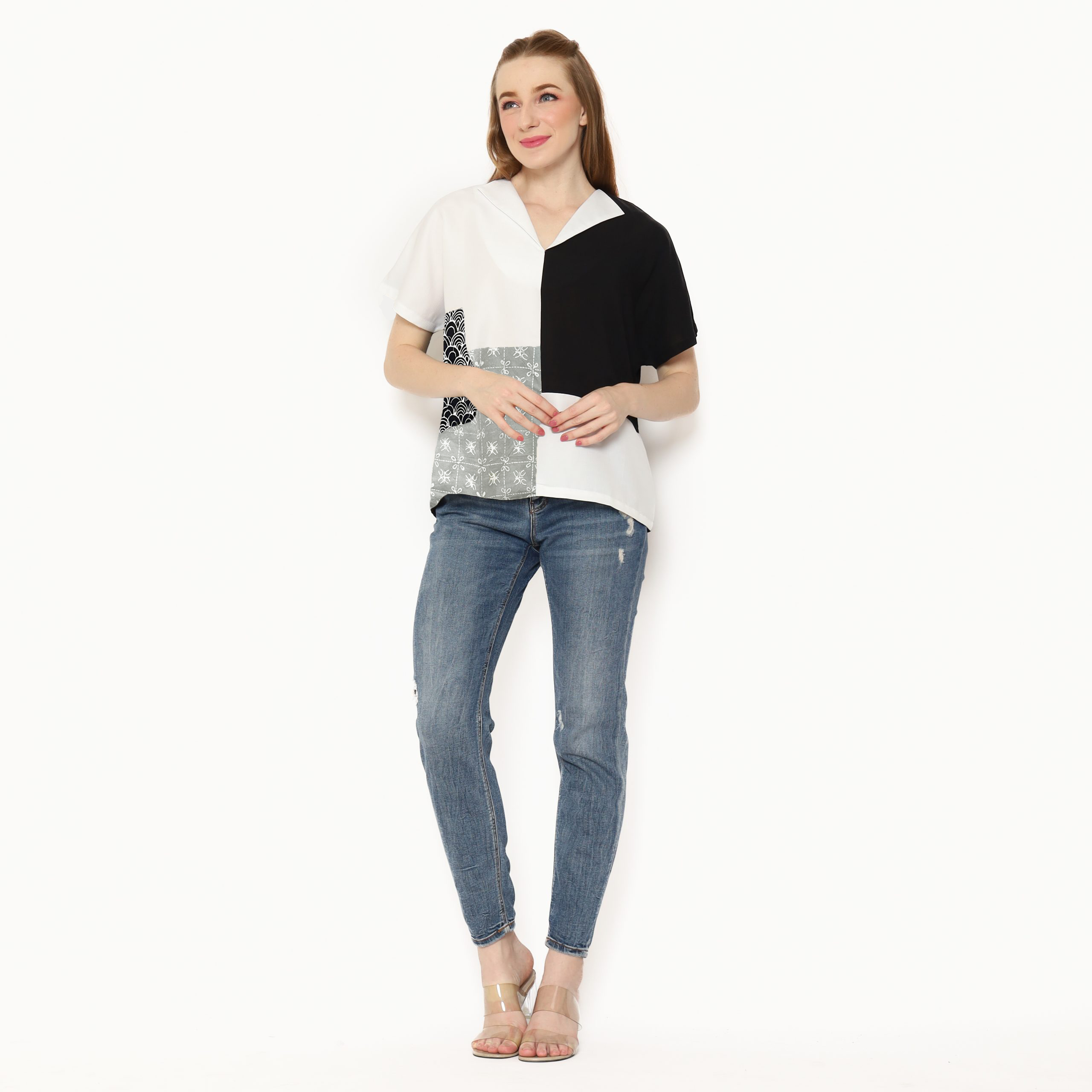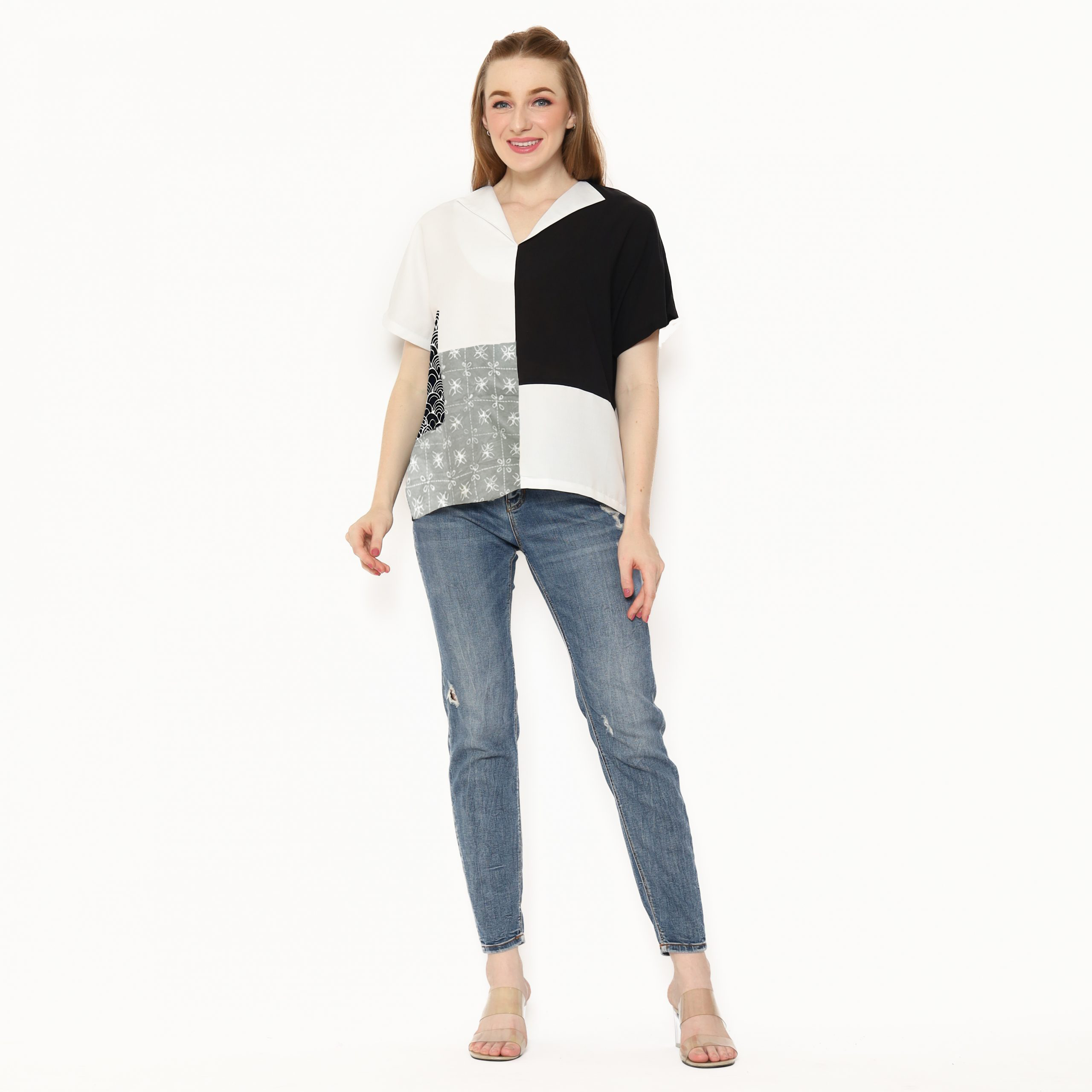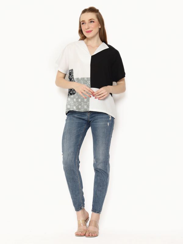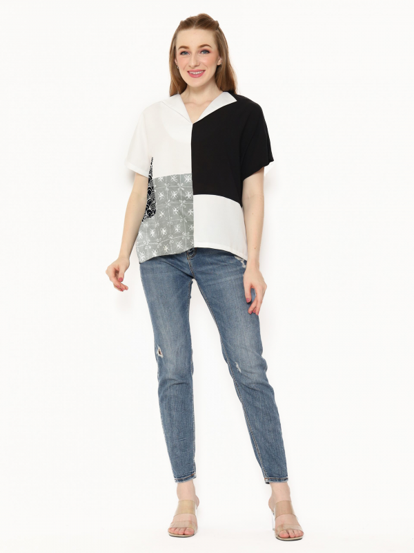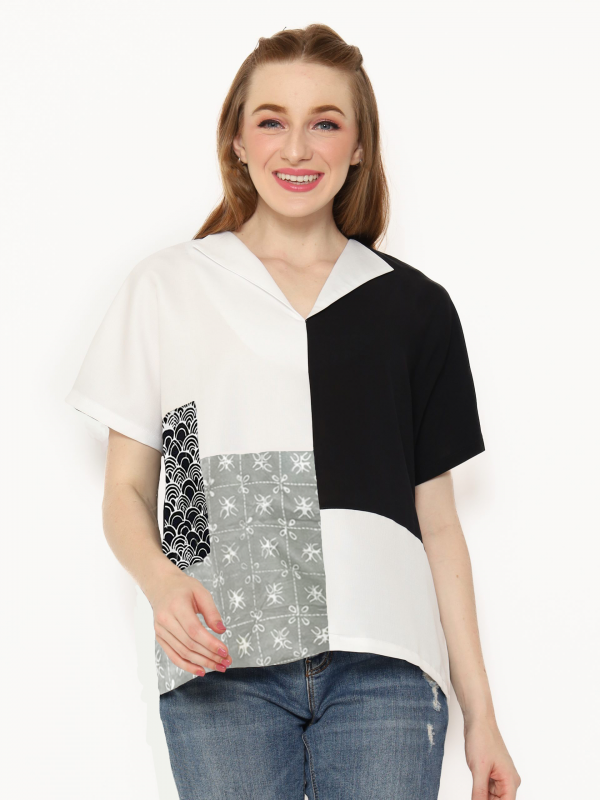 1. Blouse batik cap desain color block untuk modern ethnic look