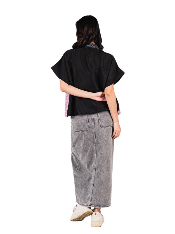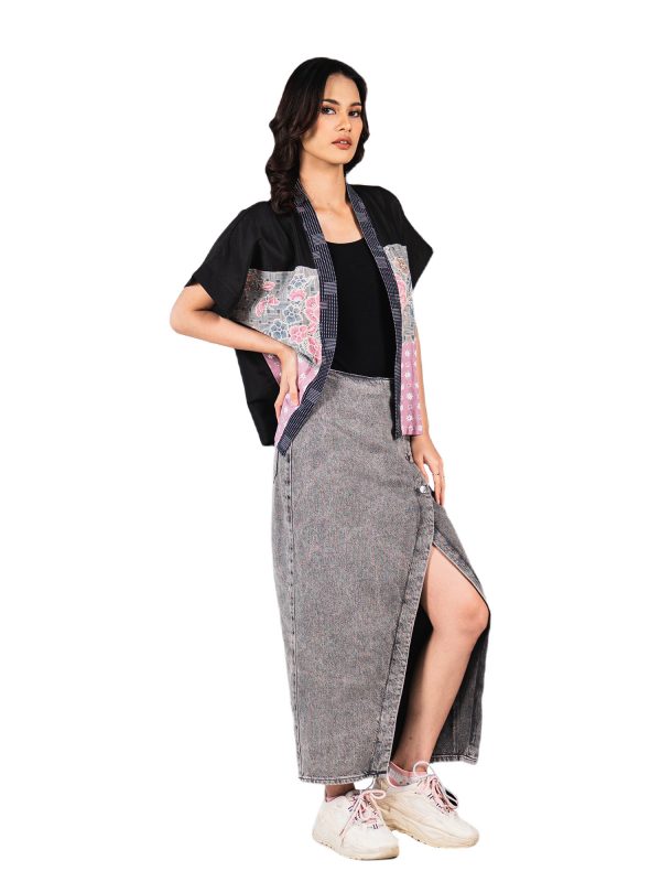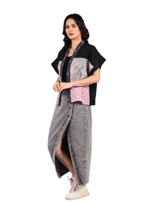 1. Blazer batik cap patchwork dengan desain boxy cut yang modern