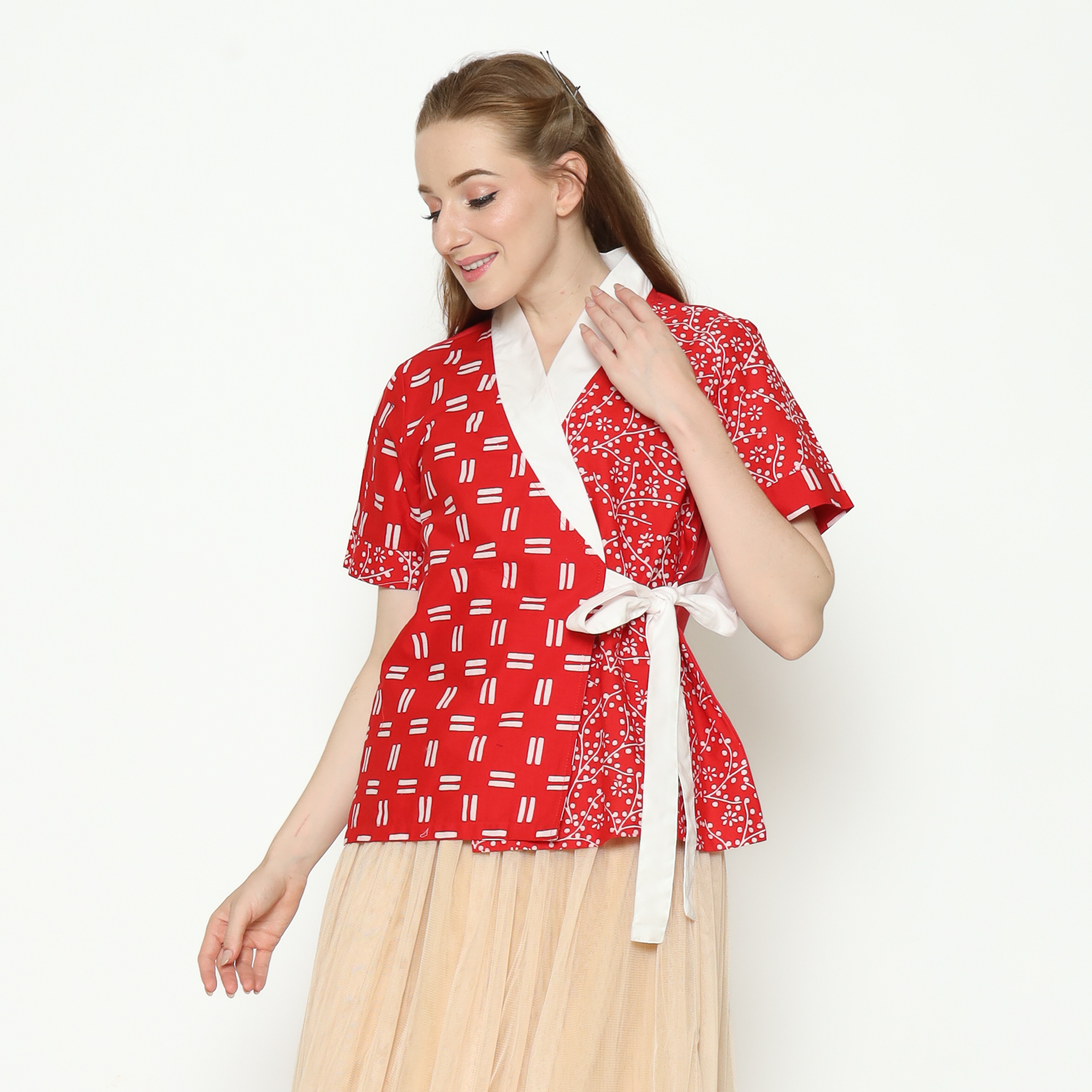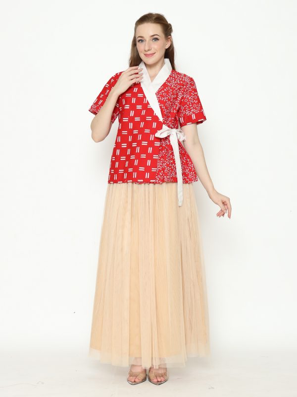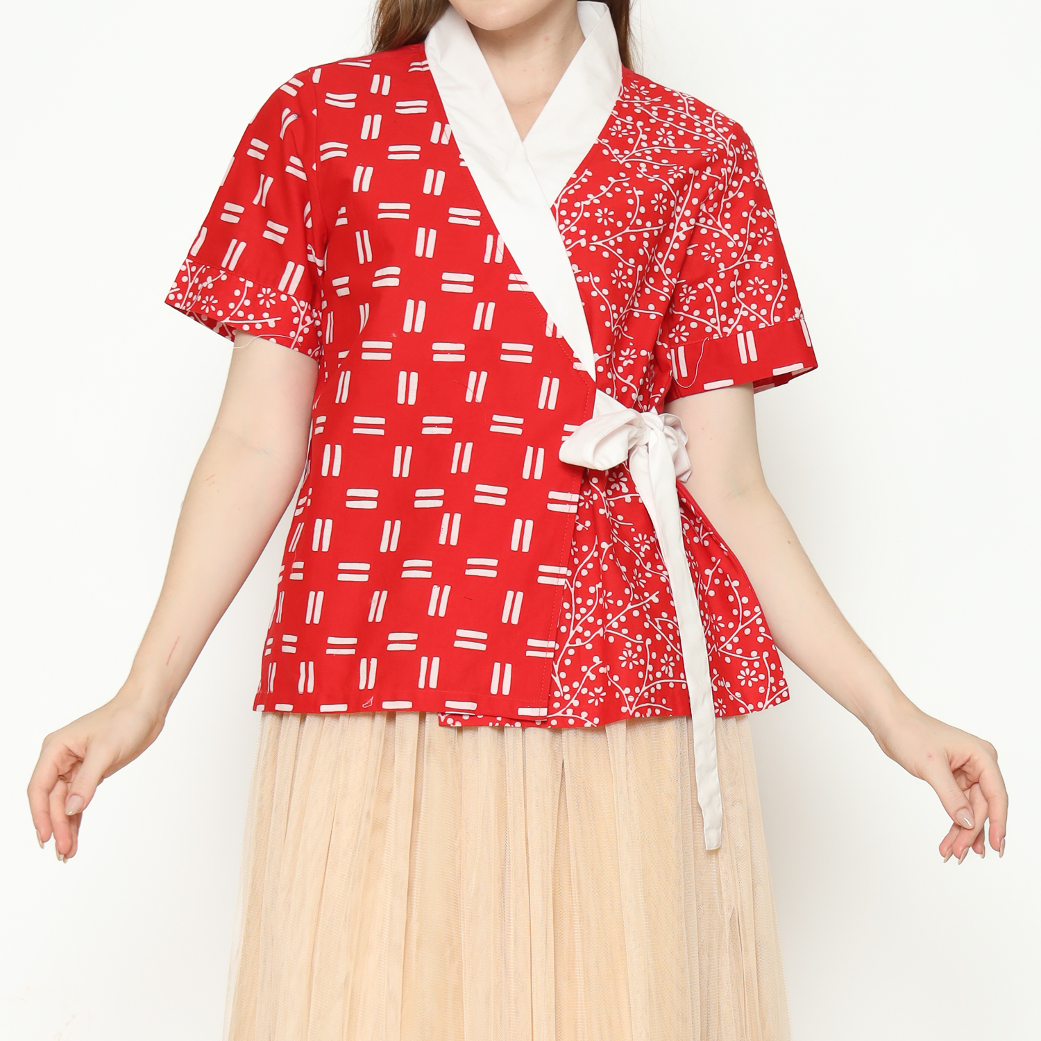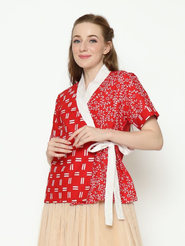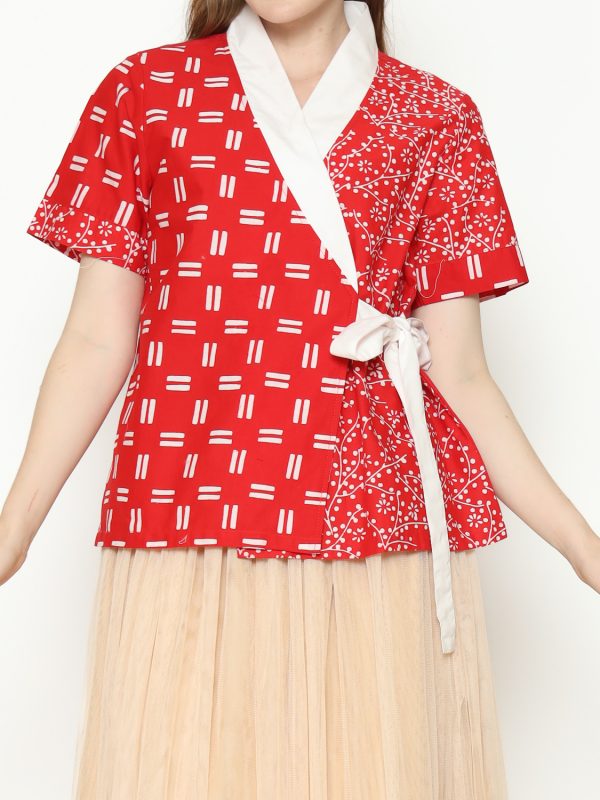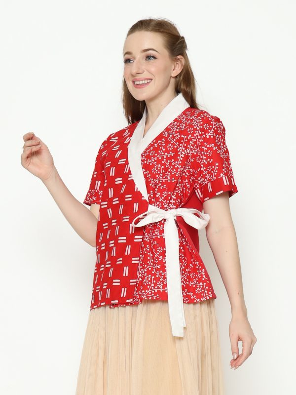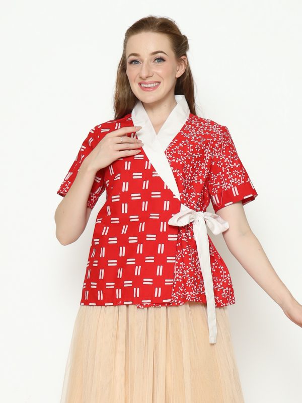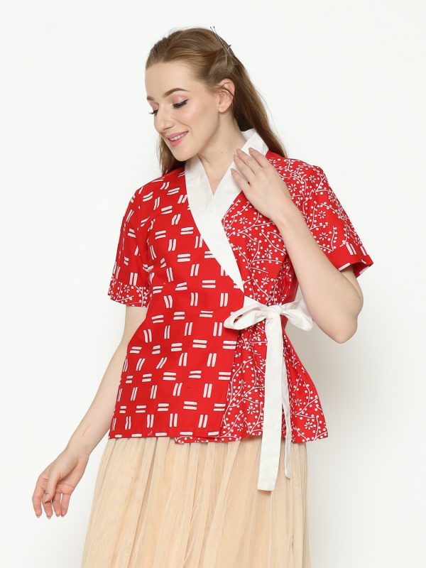 1. Blouse desain kimono dengan detail motif batik cap modern