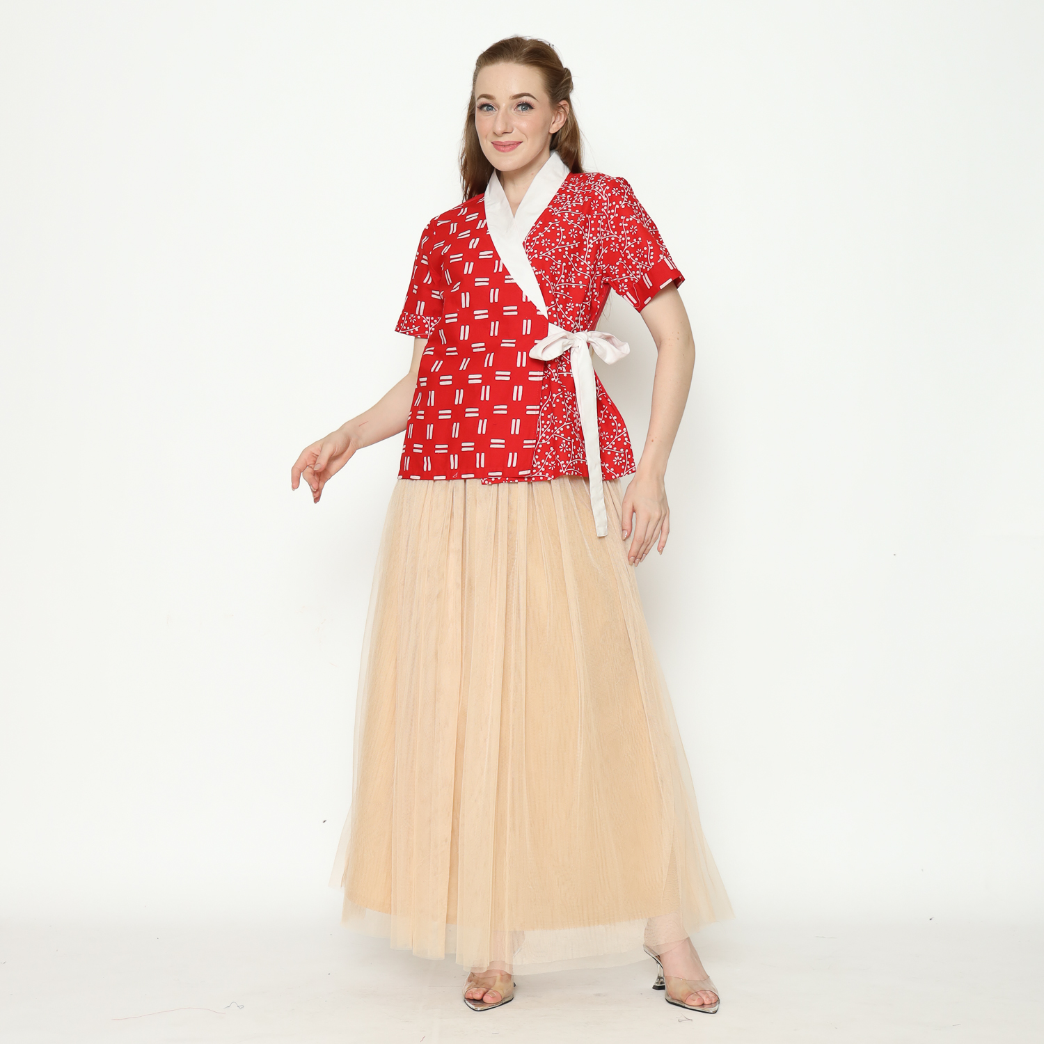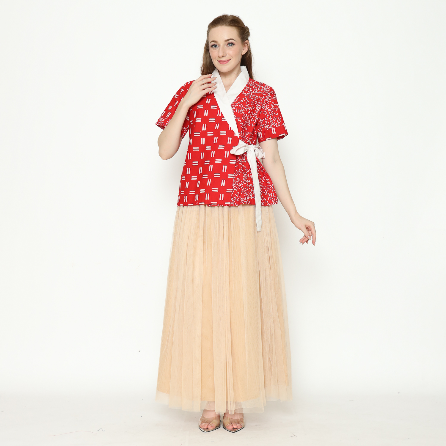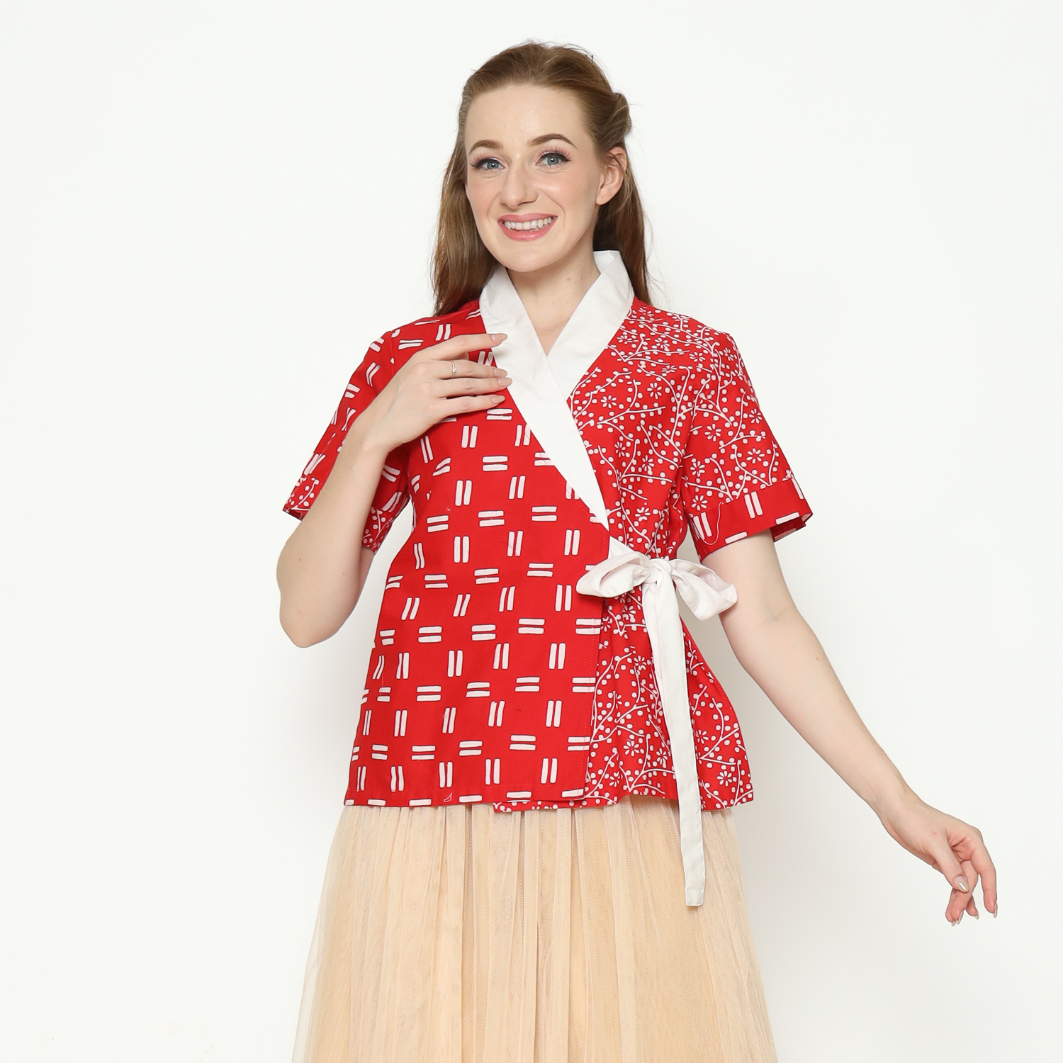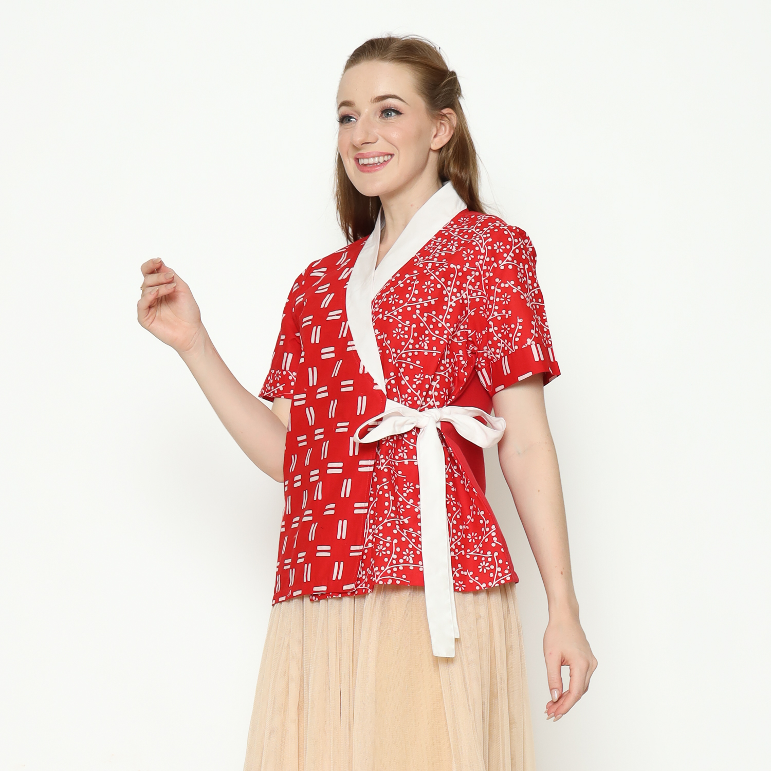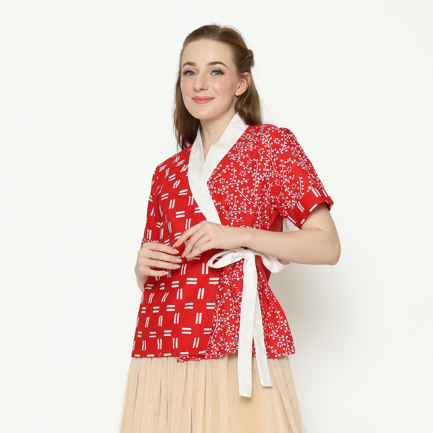 1. Blouse desain kimono dengan detail motif batik cap modern