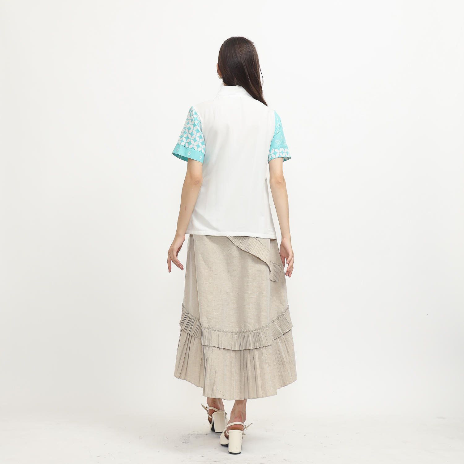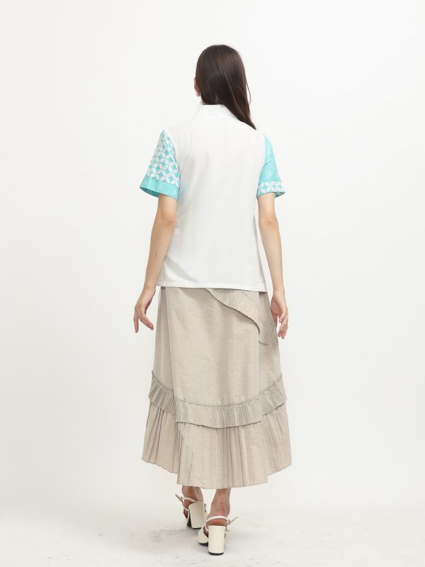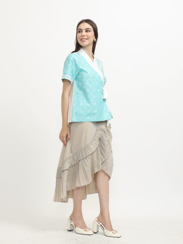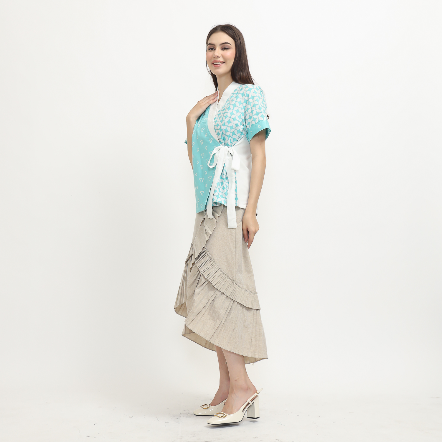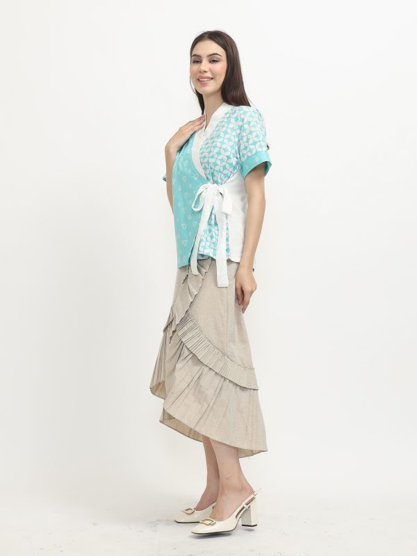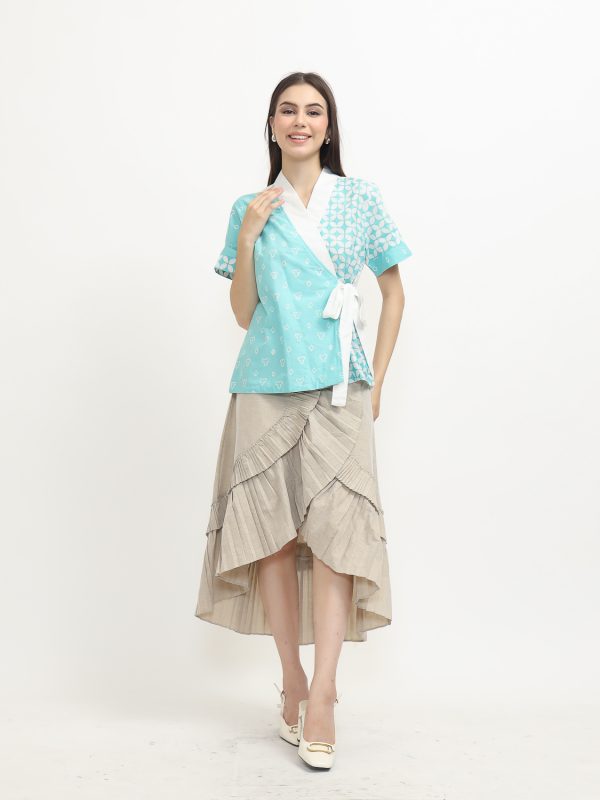 1. Blouse desain kimono dengan detail motif batik cap modern
