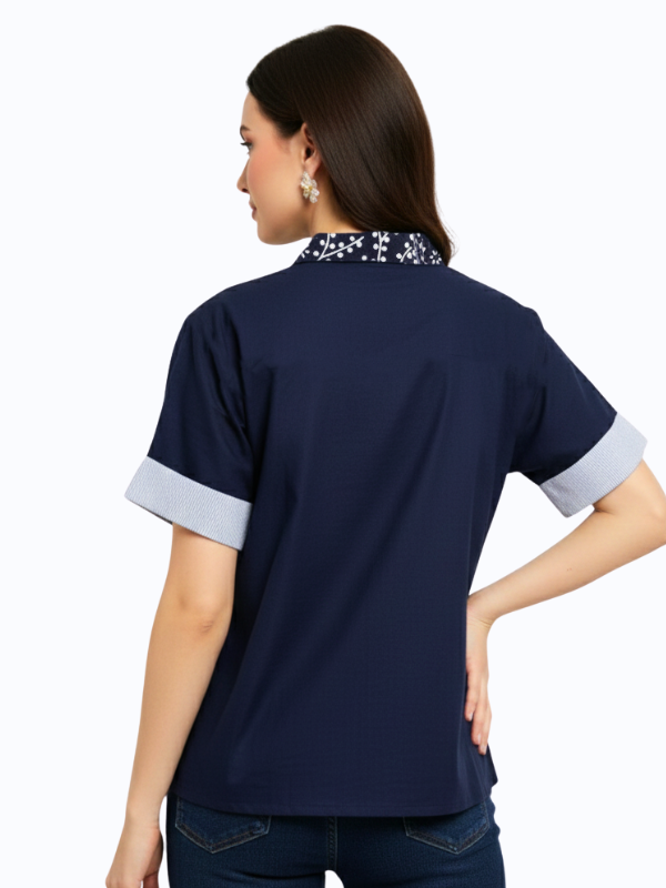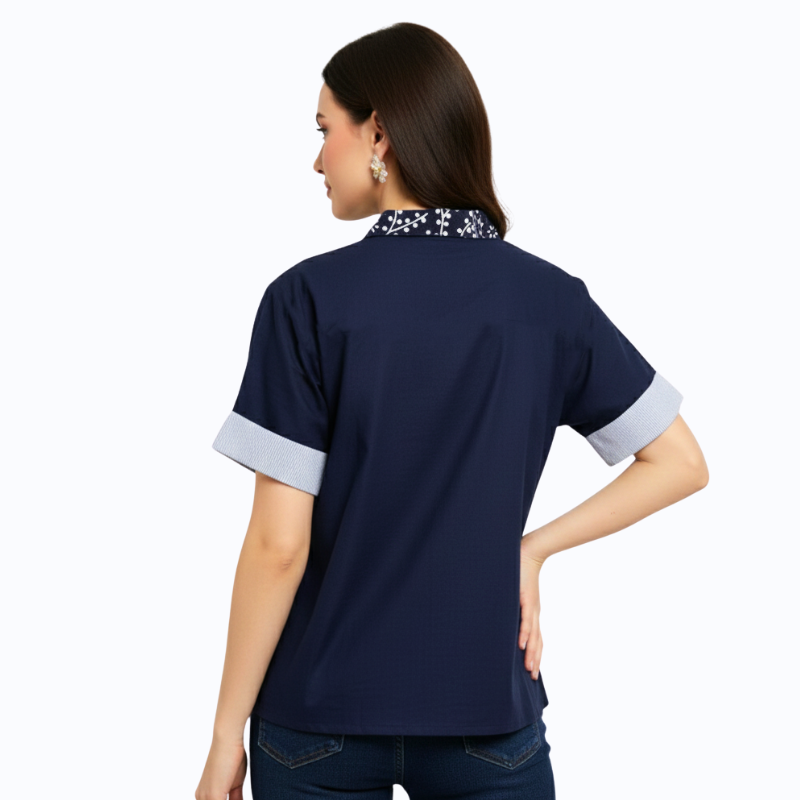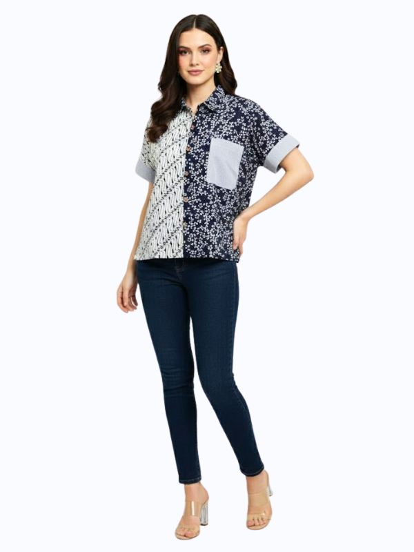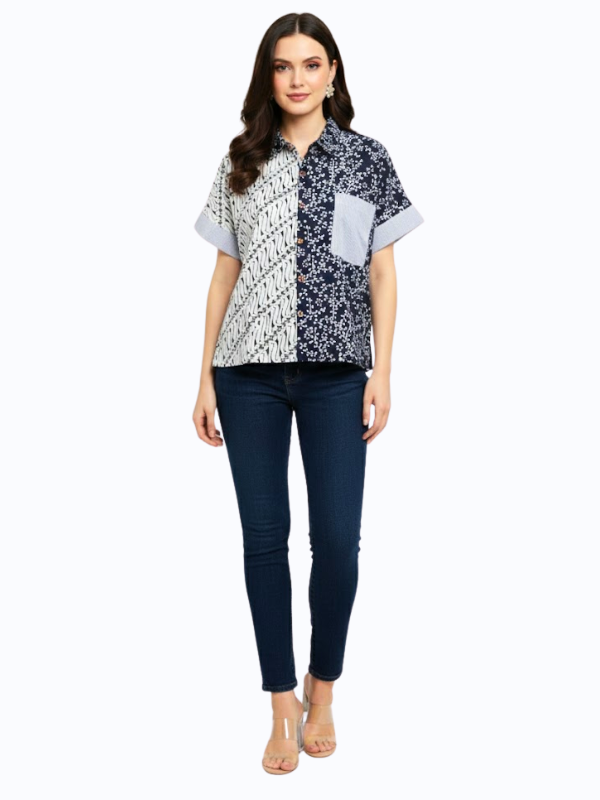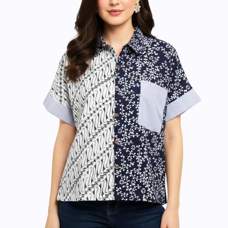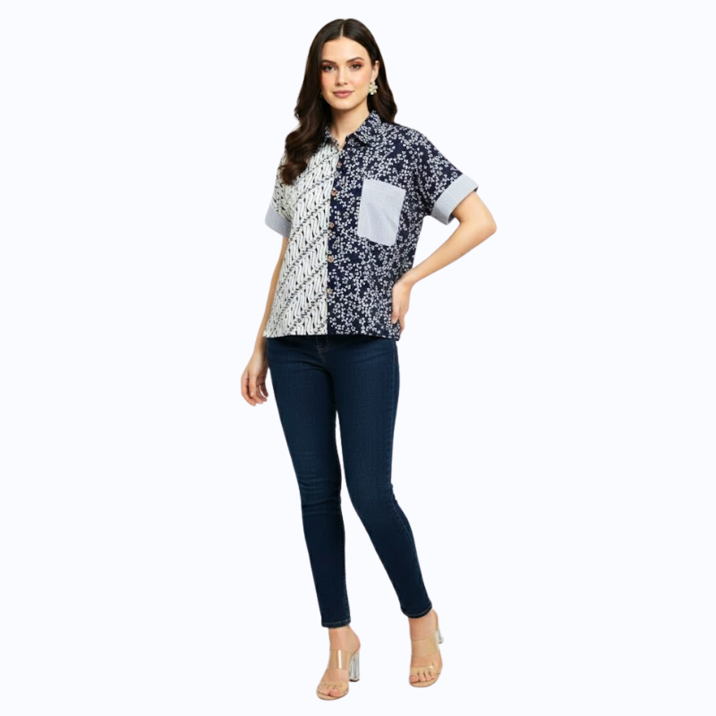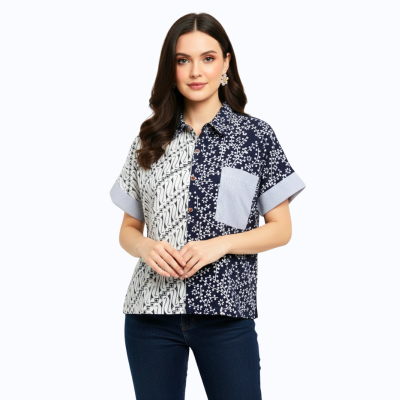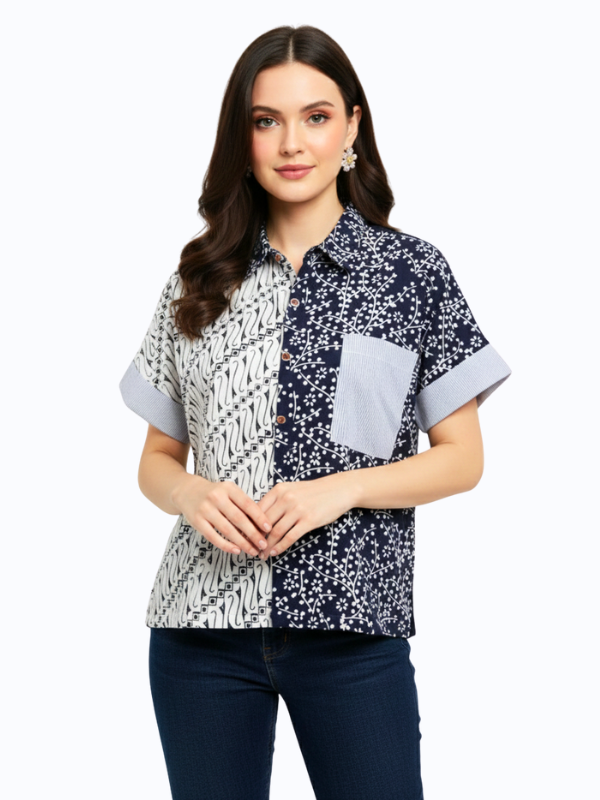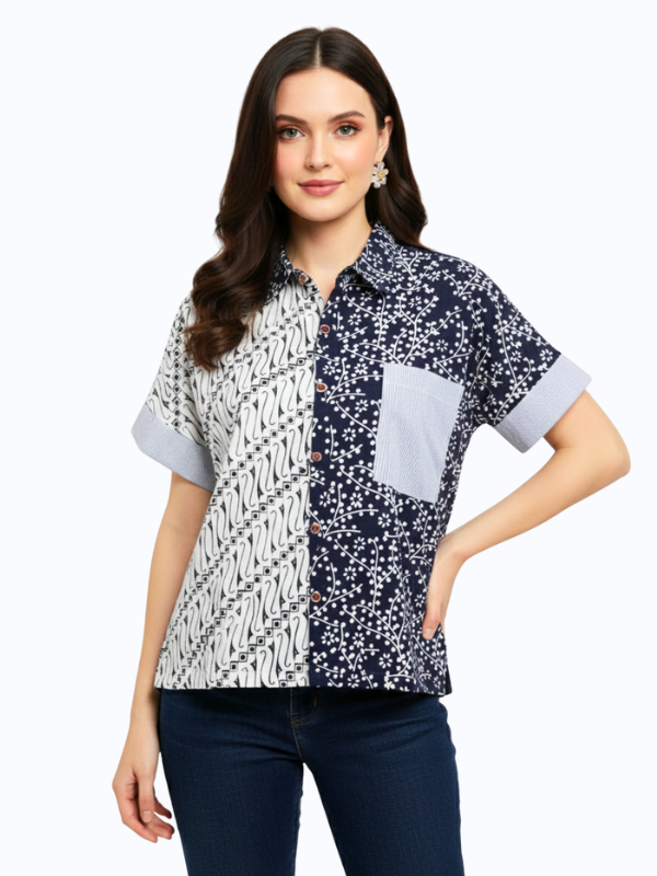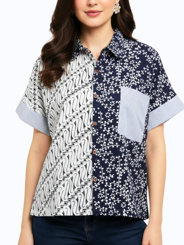 1. Kemeja bergaya semi formal detail motif batik cap yang modern