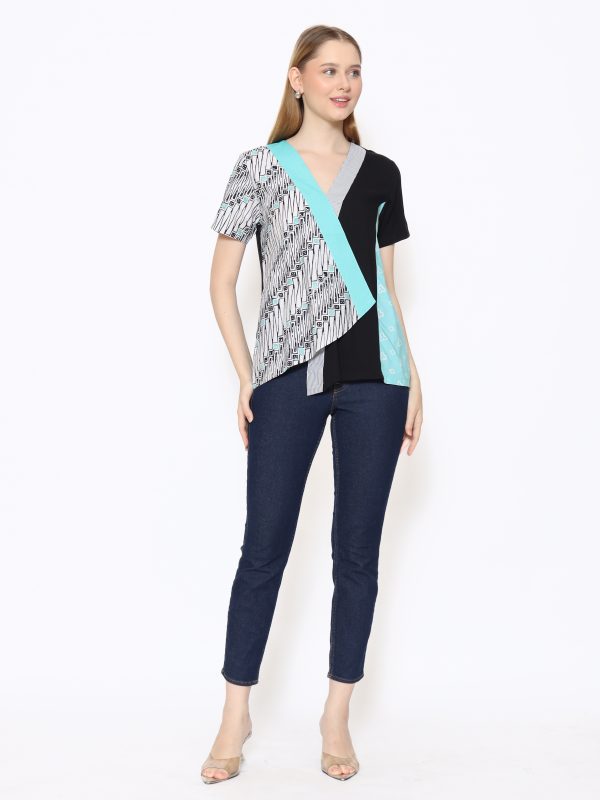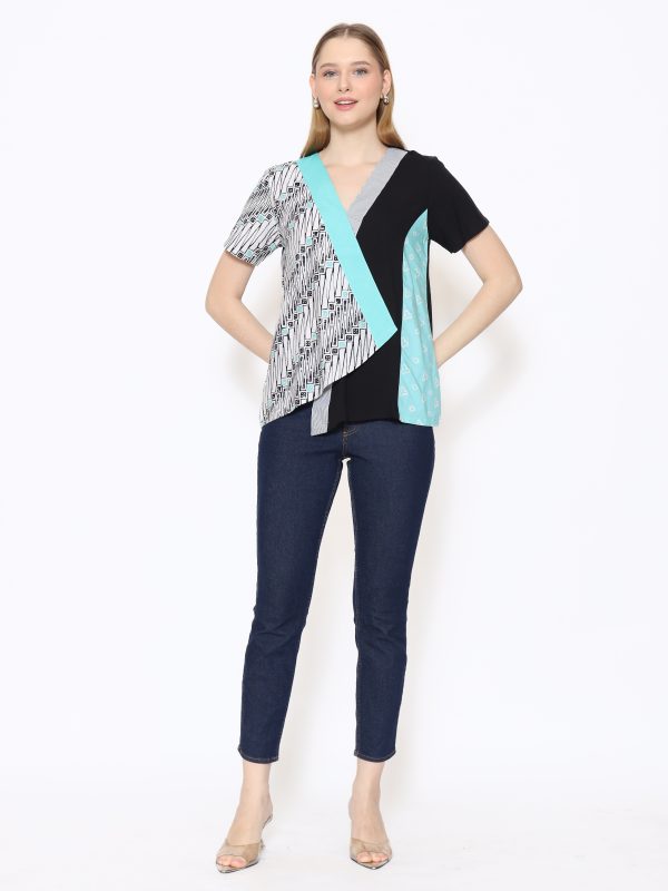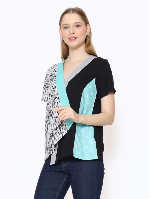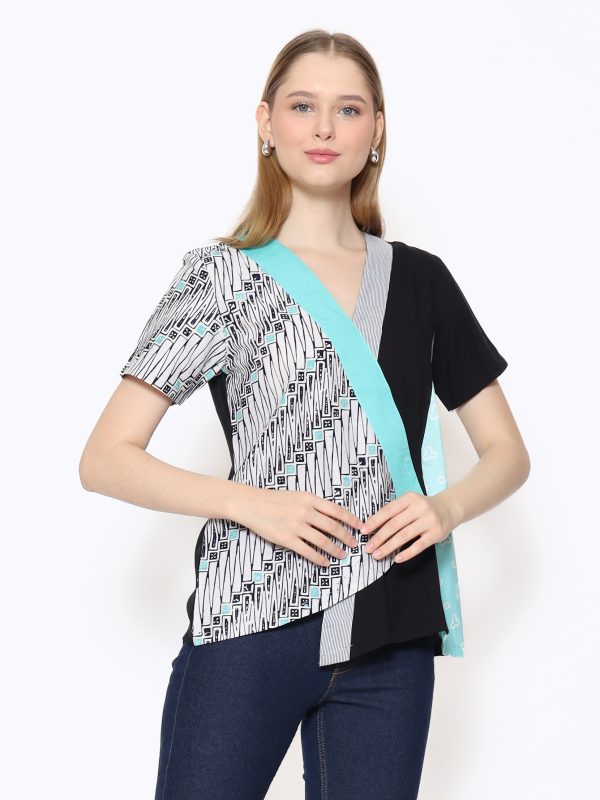 1. Blouse batik cap dengan desain body wrap yang modern