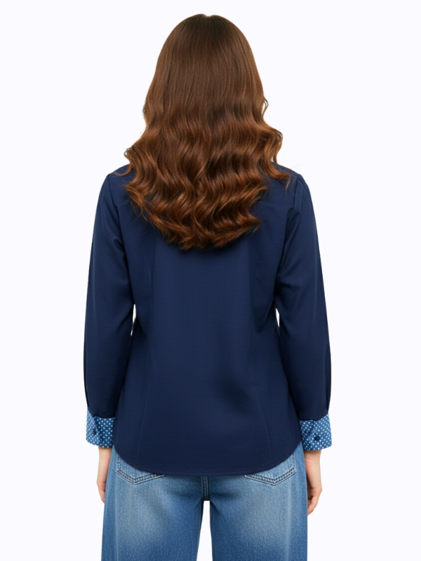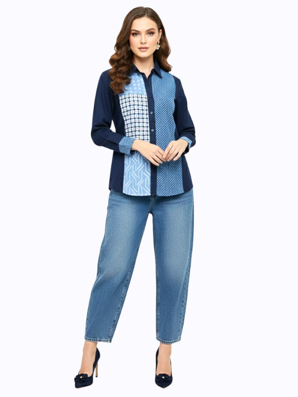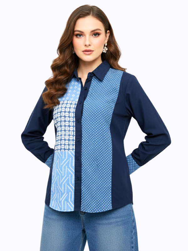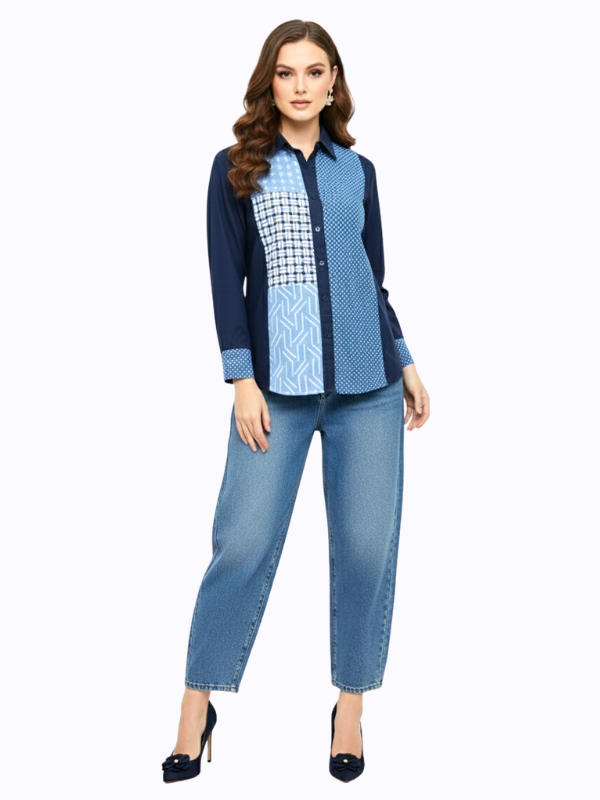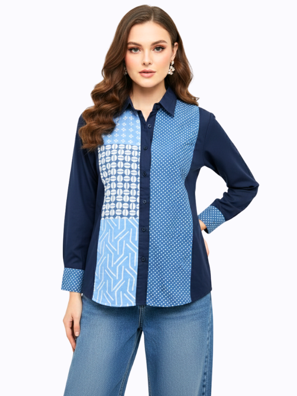 1. Kemeja wanita bergaya semi formal detail motif patchwork batik cap yang modern