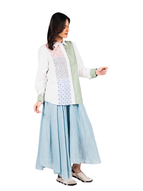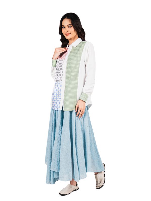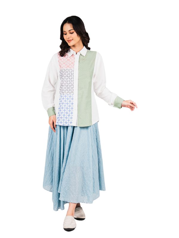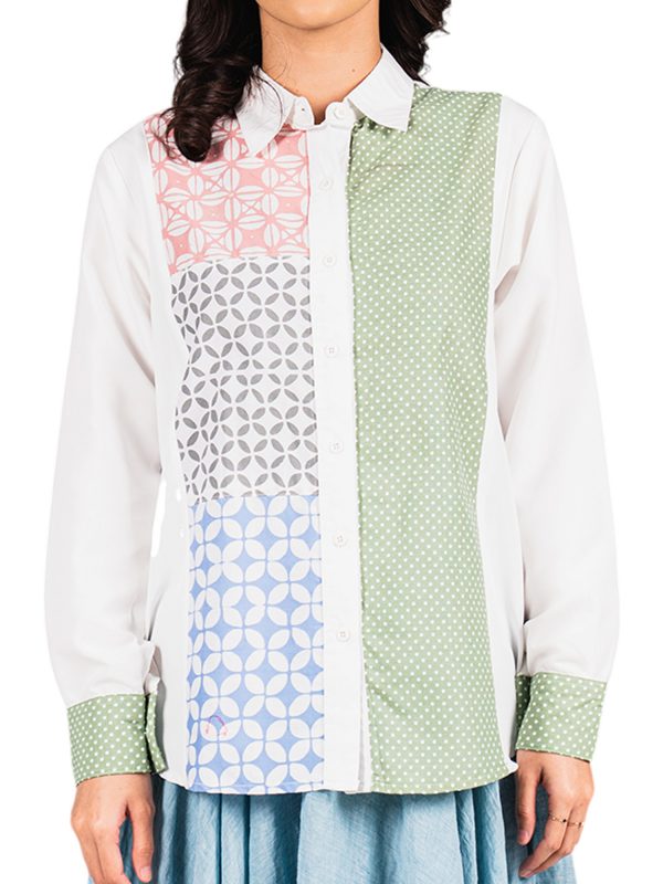1. Kemeja wanita bergaya semi formal detail motif patchwork batik cap yang modern