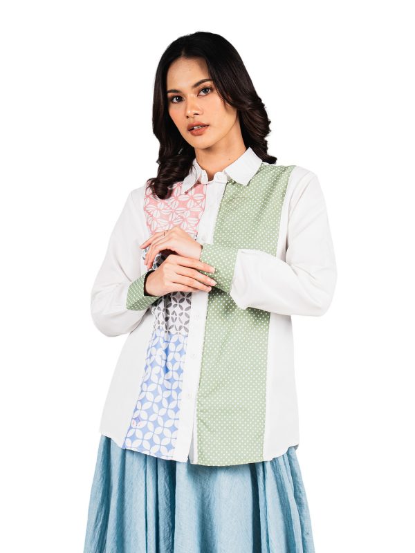 1. Kemeja wanita bergaya semi formal detail motif patchwork batik cap yang modern